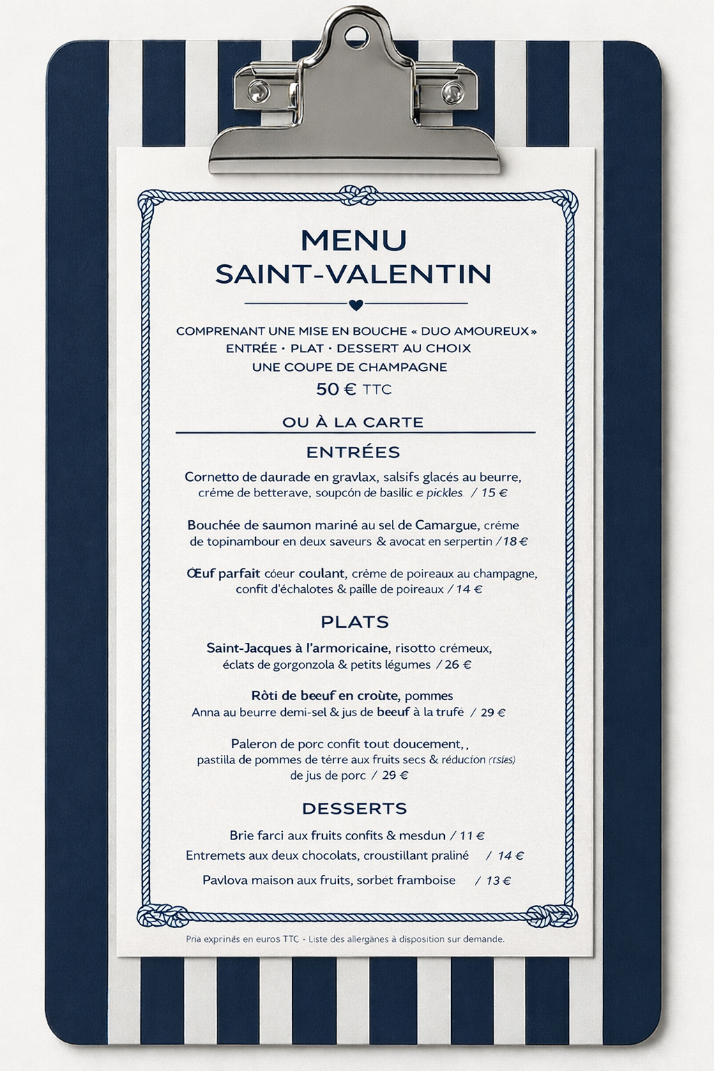 Pour ensoleiller les assiettes, du petit déjeuner au dîner, l'offre s'articule autour d'une cuisine méditerranéenne, saine, équilibrée, fine et goûteuse, composée de produits frais et de saison, avec une préférence pour les poissons et produits de la mer, les volailles ou les viandes blanches, accompagnés essentiellement de légumes du soleil, d’herbes et d’épices, d’huile d’olive, de fruits de la vigne et du verger.